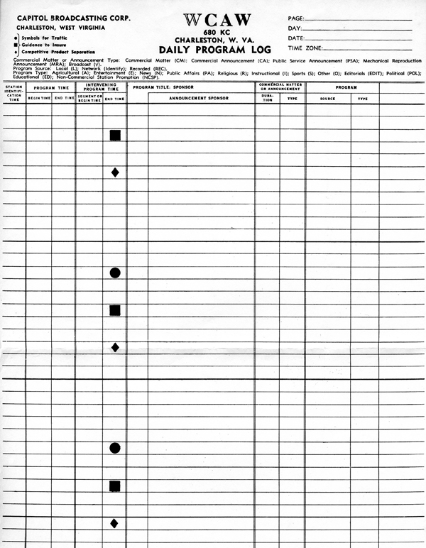 - Blank program log. The geometric shapes were used to help keep competing sponsor’s commercials from running back-to-back. For instance, car dealers might be placed next to squares.
